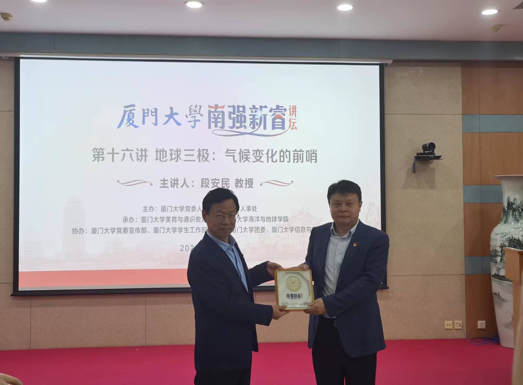 受学校委托,讲坛正式开始前,人事处处长李军教授为段安民颁发“南强新睿讲坛”纪念牌。李军强调,学校长期以来坚持举办“南强新睿讲坛”,旨在展示厦门大学新引进人才风采,建立师生沟通平台和桥梁,具有重要意义。海洋与地球学院院长史大林主持讲坛,他向与会师生介绍了段安民的科研经历和研究方向,以及厦大海洋学科在海洋动力过程与气候变化研究方面的坚实基础,邀请师生们通过文字直播弹幕的形式提出问题、互相交流,呼吁师生重视全球气候变化、关注地球三极。