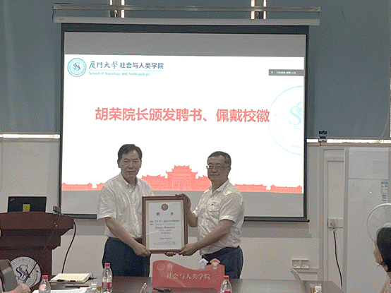 会议伊始,冯文晖简要介绍了何明教授在民族学等领域的杰出贡献,胡荣院长为何明教授颁发聘书、佩戴校徽。并代表学院对何明教授的倾情加盟表示了热烈的欢迎。